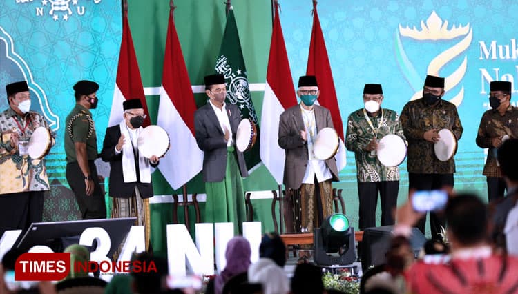 TIMES Gresik/Presiden Jokowi (Joko Widodo) membuka secara resmi Muktamar Ke-34 Nahdlatul Ulama di Pondok Pesantren Darussa’adah, Gunung Sugih, Lampung Tengah, Rabu (22/12/2021). (FOTO: Moh Ramli/TIMES Indonesia)